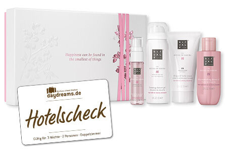 Das Wellnesspaket von daydreams eignet sich ideal, um sich oder Ihre Liebsten zu verwöhnen. Verschenken Sie entspannte Glücksmomente mit dem Ritual of Sakura Geschenkset S und stimmen Sie sich mit dem daydreams Hotelscheck auf Ihren nächsten Kurzurlaub ein.